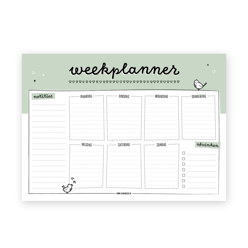 Weekplanner A4Geen stress! Noteer al je afspraken, klusjes, feestjes, uitjes, verplichtingen etc. op deze weekplanner van Thuismusje en zorg voor meer rust in je hoofd.